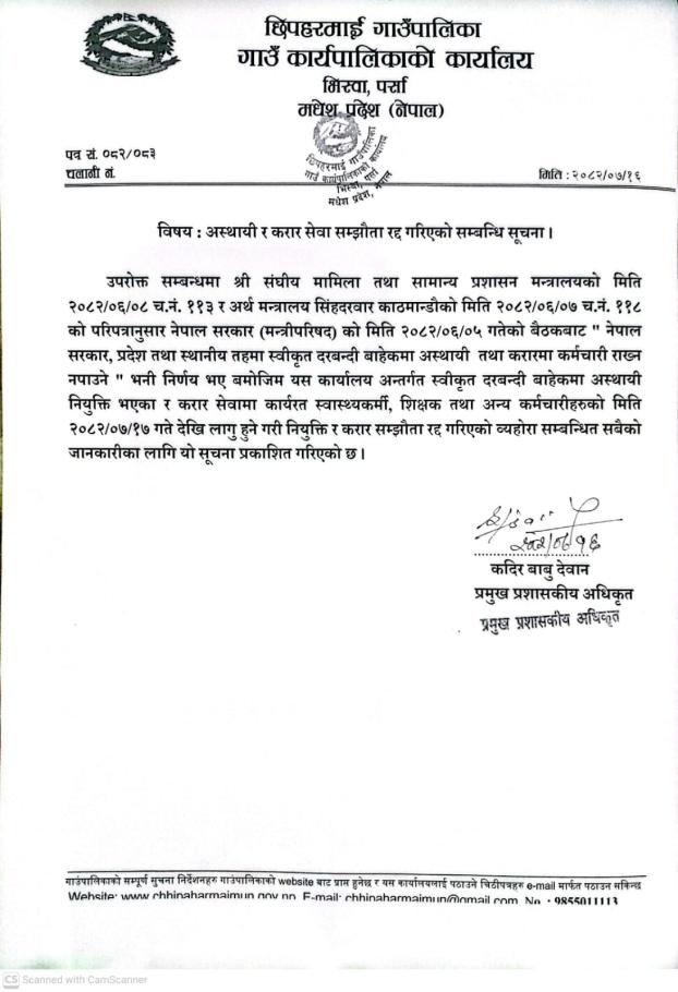 कर्मचारी करार सम्झौता रद्द सम्बन्धि सूचना -