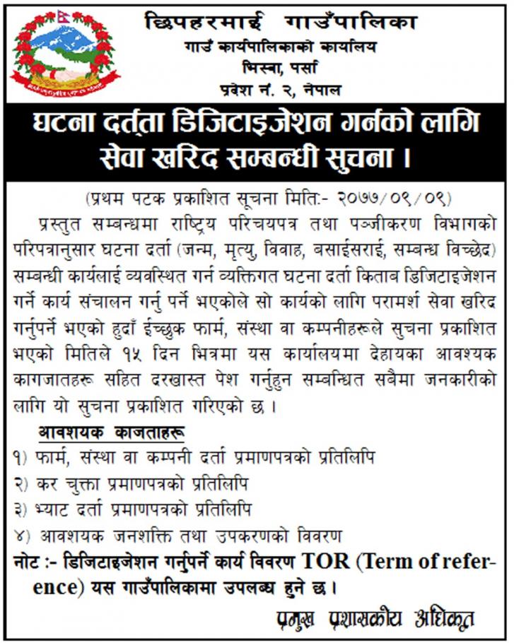 » घटना दर्ता डीजिटाईजेशन गर्नको लागि सेवा खरिद सम्बन्धि सूचना !