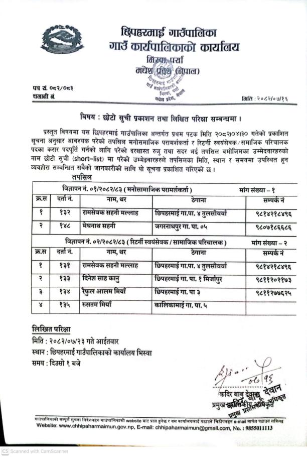 छोटो सूची प्रकाशन तथा लिखित परिक्षा सम्बन्धमा